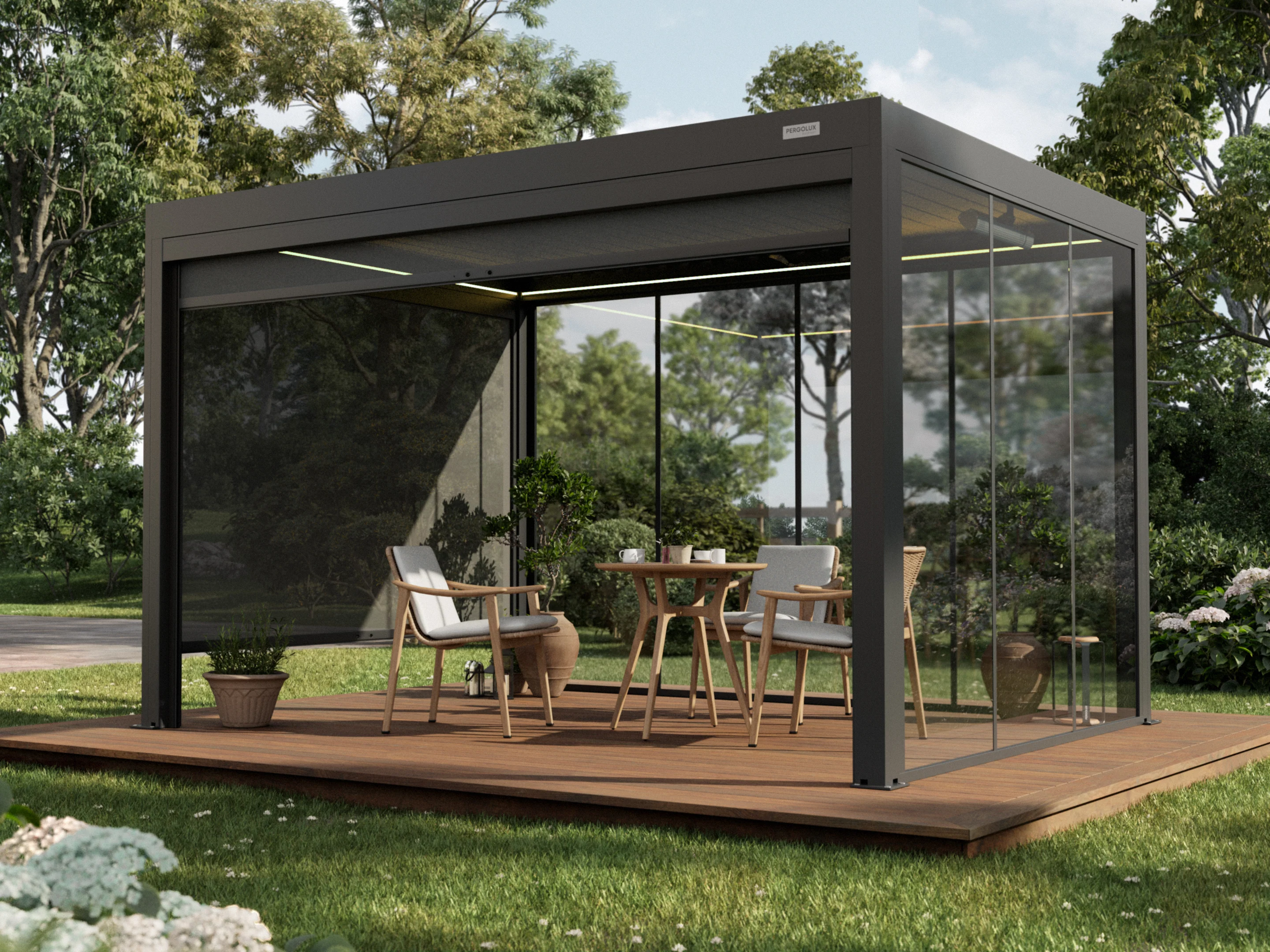 Werten Sie Ihre Pergola mit den PERGOLUX Glaswänden auf – der modernen und langlebigen Lösung für ganzjährigen Komfort.