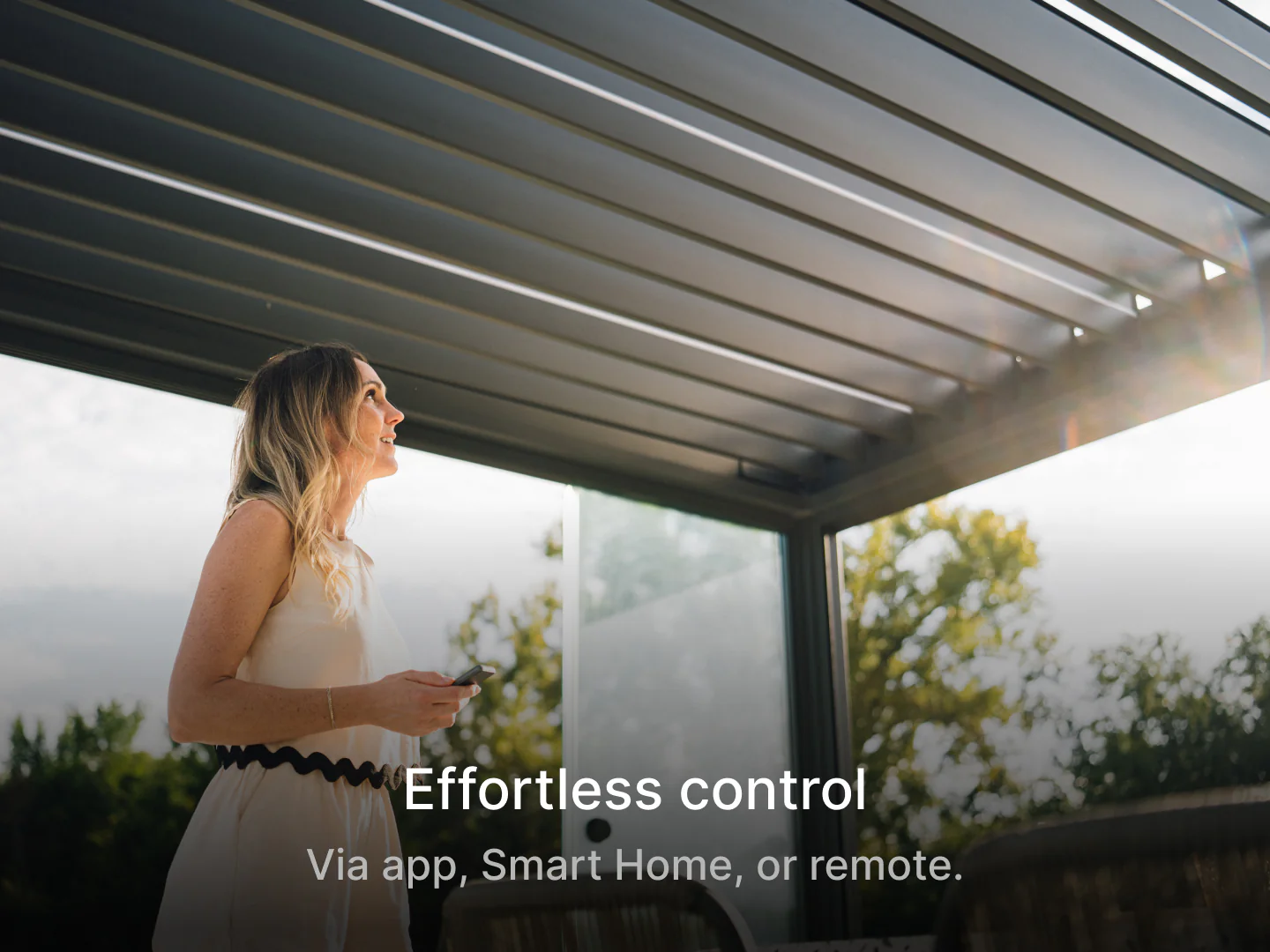 Das motorisierte Dach mit integrierter Beleuchtung in den Lamellen passt sich sofort deinen Wünschen an – geöffnet für Sonnenlicht, geschlossen für Schatten oder Regenschutz. Die einfache Steuerung per Fernbedienung, Bluetooth oder Smart-Home-Integration sorgt jederzeit für das perfekte Ambiente.